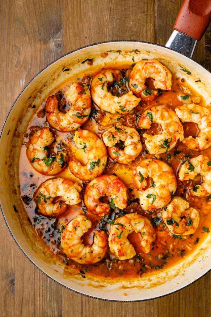 - In a large pan heat the olive oil. Cook the shrimp in batches 2-3 minutes per side.